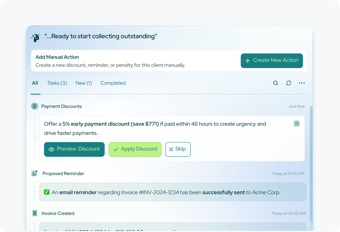 Your AI agent monitors every client, finds the right chasing strategy, and reduces late payments from day one.